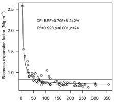 Fang J.Y., Wang G.G., Liu G.H., Xu S.L. 1998. Forest biomass of China: An estimate based on the biomass-volume relationship. Ecological Applications 8:1084-1091. DOI: 10.2307/2640963.
