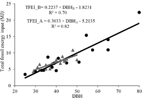 In many cases tree felling and processing operations are carried out motor-manually and knowledge about fossil fuel consumption and direct energy inputs when using such equipment is required for different purposes starting with operational costing and ending with environmental assessment of forest operations. In this study, fuel mixture, chain oil and direct fossil energy inputs were evaluated for two chainsaws which were used to fell and process trees in two silvicultural systems. The results of this study suggest that there is a strong dependence relation between selected tree size variables such as the diameter at breast height and tree volume on one hand and the fuel mixture, chain oil and direct fossil energy inputs when felling and processing broadleaved hardwood and resinous softwood trees on the other hand. For the broadleaved trees (mean tree volume of 1.50 m3 × tree-1, DBH of 45.5 cm and tree height of 21.84 m) the mean direct fossil energy input was of 3.86 MJ m-3 while for resinous trees (mean tree volume of 1.77 m3 tree-1, DBH of 39.28 cm and tree height of 32.49 m) it was of 3.93 MJ m-3. Other variables, including but not limited to the technology used, work experience and procedural pattern, may influence the mentioned figures and extensive studies are required to clarify their effects.